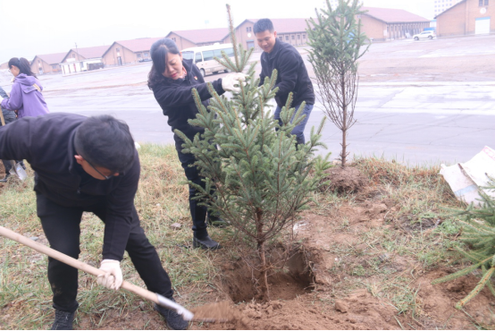 在園區(qū)內(nèi),大家興致勃勃,干勁十足,有的揮鍬挖坑、有的搬運(yùn)樹苗、有的扶苗培土、有的提水澆灌,經(jīng)過3個(gè)小時(shí)的忙碌,100棵松柏昂然挺立,呈現(xiàn)出一派生機(jī)勃勃的景象。