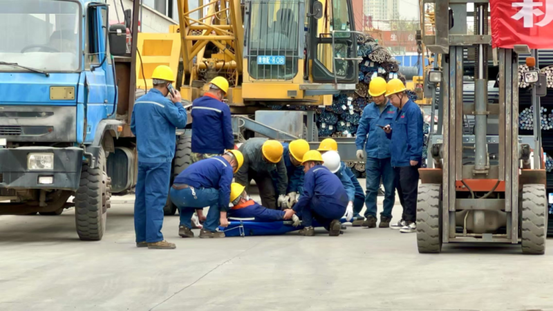 本次演練模擬鋼板區(qū)在進(jìn)行吊裝作業(yè)時(shí)突發(fā)輪胎起重機(jī)吊裝貨物擺幅過大傷人事故。演練前期,制定了詳細(xì)方案并組織培訓(xùn),籌備救援、醫(yī)療等物資,布置模擬場(chǎng)景。演練啟動(dòng)后,通訊聯(lián)絡(luò)組迅速傳遞事故信息,現(xiàn)場(chǎng)指揮組即刻啟動(dòng)應(yīng)急響應(yīng)。警戒疏散組快速隔離現(xiàn)場(chǎng)、疏散人員;應(yīng)急救援組解救受傷人員、排除設(shè)備故障;醫(yī)療救護(hù)組對(duì)傷員緊急救治并送醫(yī);后勤保障組及時(shí)供應(yīng)物資,各環(huán)節(jié)有序推進(jìn)。
