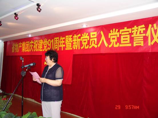我宣誓:"我志愿加入中國共產黨,擁護黨的綱領,遵守黨的章程,履行黨員義務,執(zhí)行黨的決定,嚴守黨的紀律,保守黨的秘密,對黨忠誠,積極工作,為共產主義奮斗終身,隨時準備為黨和人民犧牲一切,永不叛黨"。6月29日上午10∶00時,17名新加入黨組織的中國共產黨預備黨員、所屬各黨組織書記、老黨員代表等30余人的莊嚴宣誓,標志著青海物產系統(tǒng)慶祝建黨91周年系列活動正式展開。